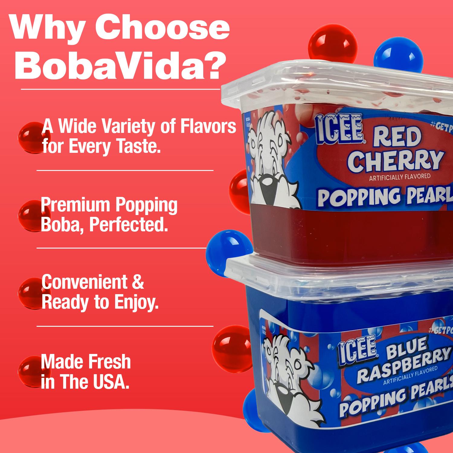 - What’s Inside – 2 tubs of ICEE by BobaVida Popping Boba Pearls (1 Blue Raspberry + 1 Cherry)!